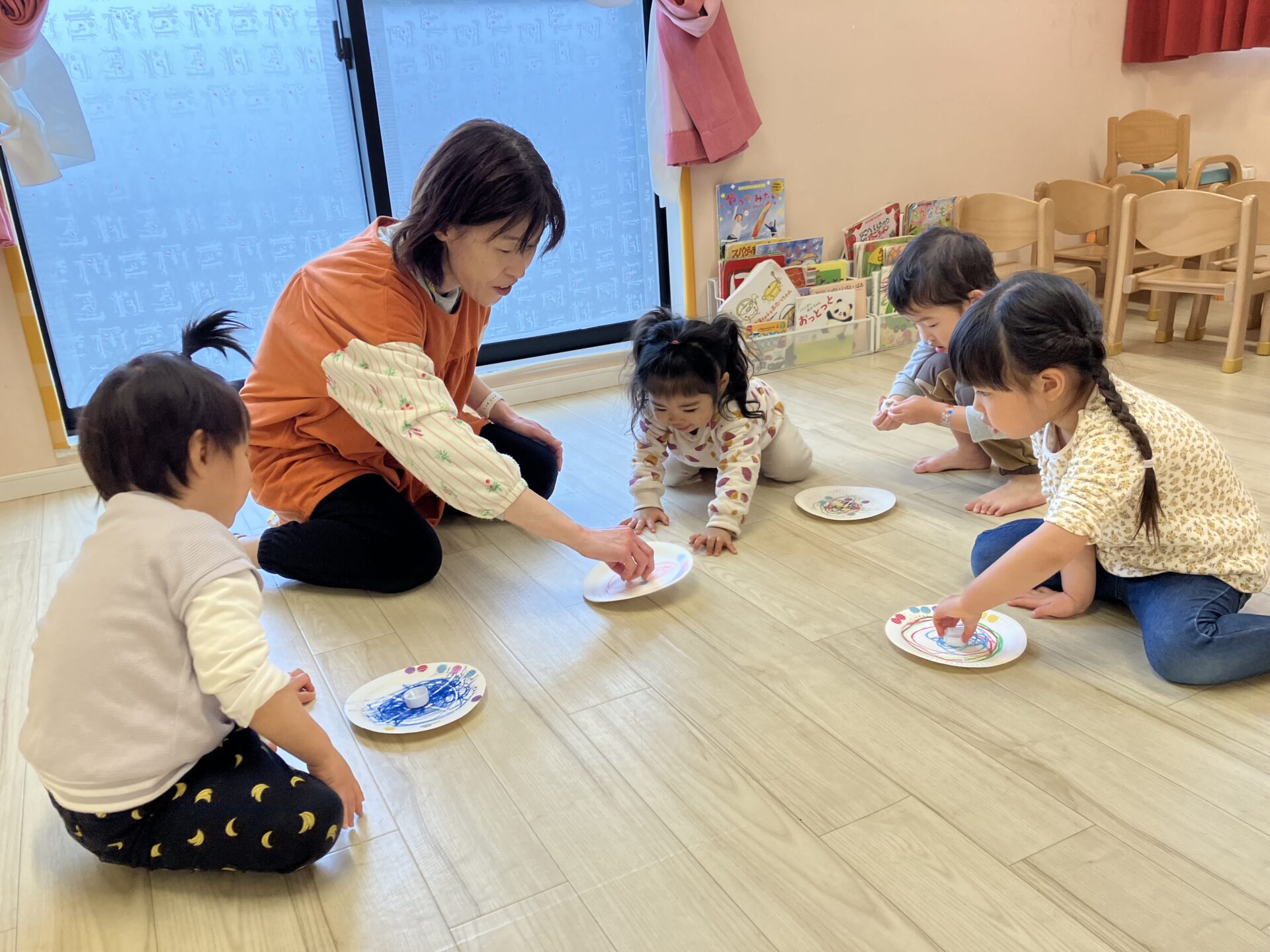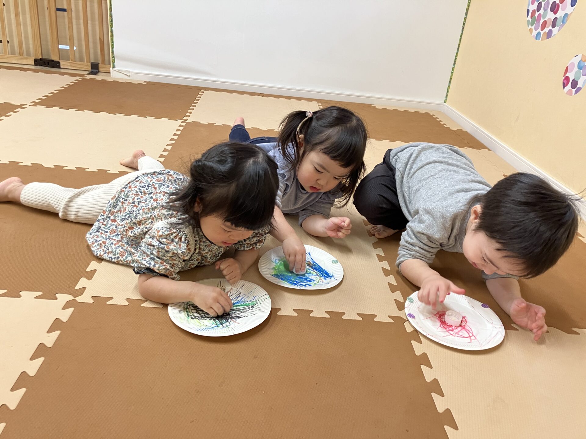 二つ目のお正月遊びは♪コマ遊び♪紙皿にクレヨンで絵を描き、素敵なコマの完成😃ぱんだ組さん、うさぎ組さんは自分でコマを回して楽しむことが出来ました👏