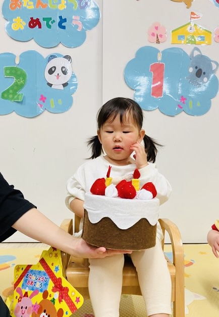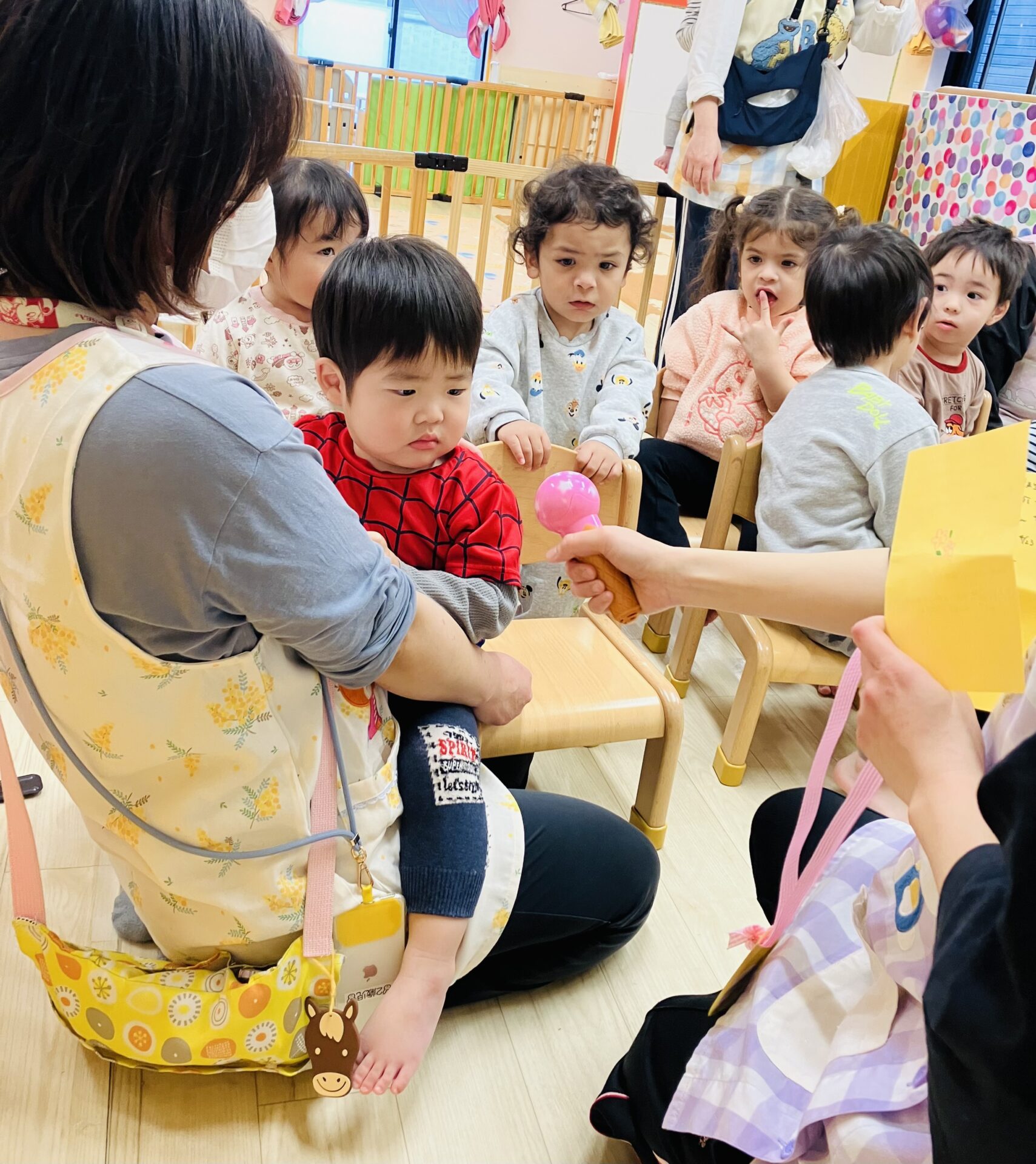みんなでお誕生日の歌でお祝いをしたあと、保育者の『お花がわらった🌼』のペープサートを楽しみました。